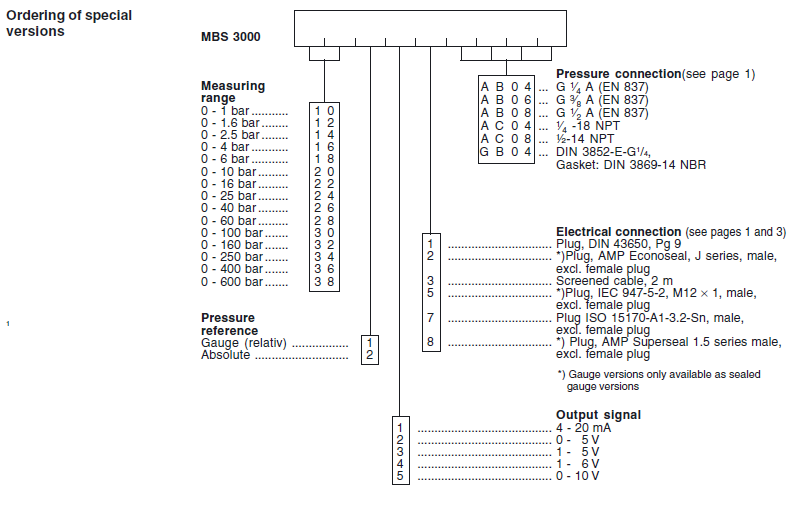 - Bảng mô tả đặc tính mã hàng cùng cách chọn lựa thiết bị cảm biến áp suất Danfoss MBS3000.