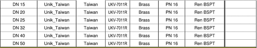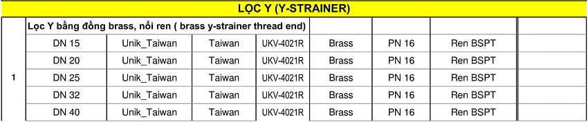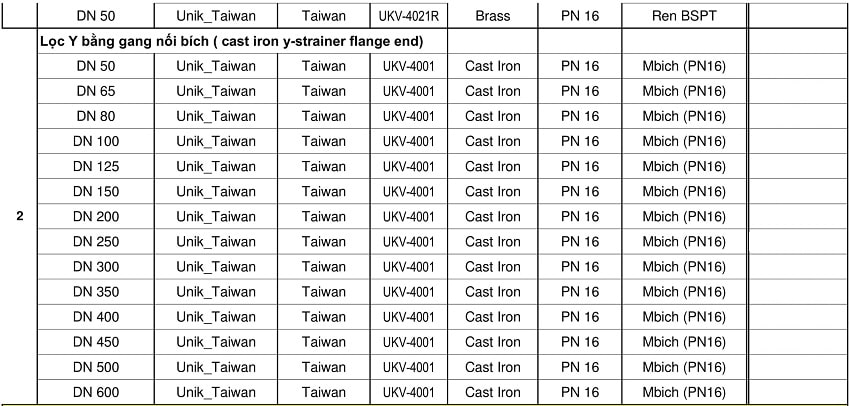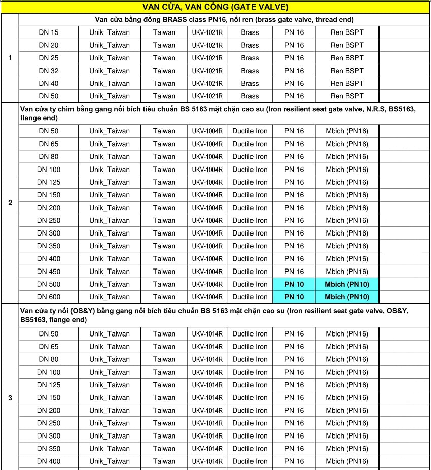Bảng giá van Unik Đài Loan