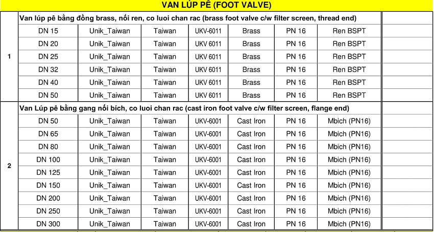 Bảng giá van lúp pê, bảng giá rọ hút Unik
