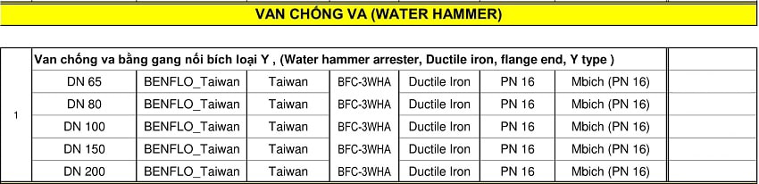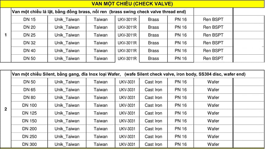 Bảng giá van một chiều Unik