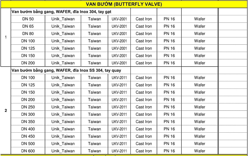 Bảng giá van bướm Unik