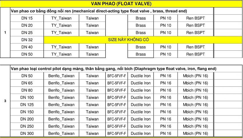 Bảng giá van phao Unik