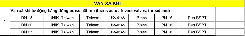 Bảng giá van chống va Unik, Bảng giá van xả khí Unik