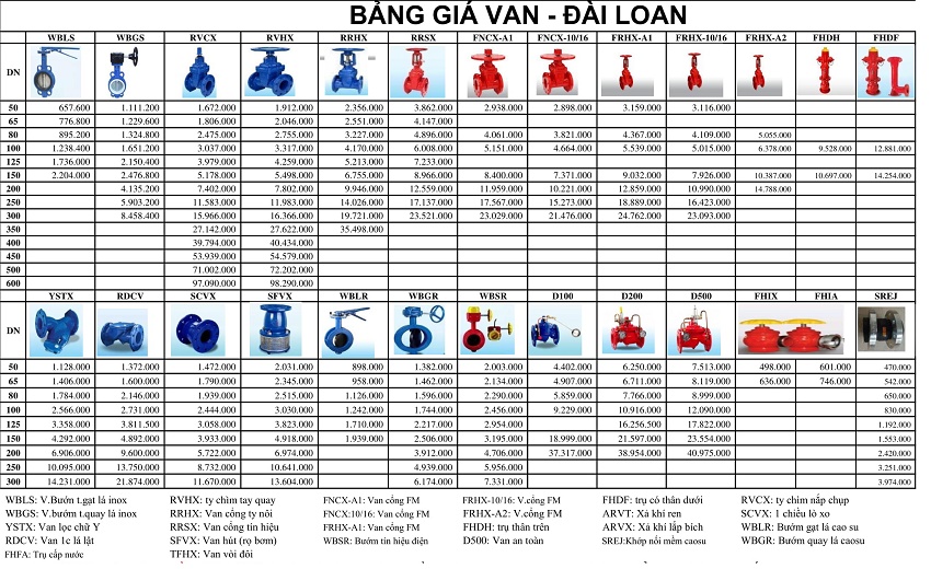 Bảng giá van Taiwan trên chi mang tính chất tham khảo, giá có sự thay đổi do nhà cung cấp, để được báo giá chính xác nhất hãy gửi tên số lượng vào mail: erikovn.sg@gmail.com hoặc liên hệ tới hotline: 0988628586.