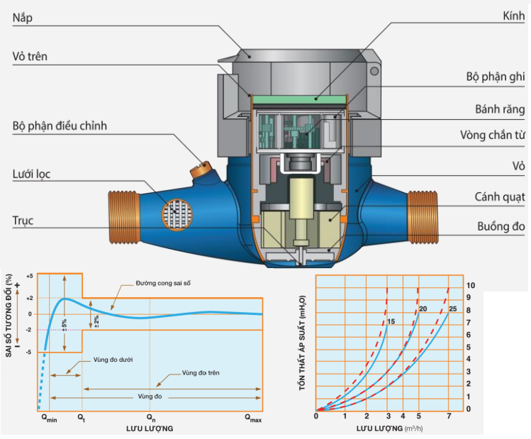 -Cánh quạt được làm bằng nhựa chịu nhiệt và áp lực cao để làm việc tốt, bền hơn trong môi trường áp lực, phần lớn cánh quạt được bảo vệ bởi một bao chắn rác nhằm ngăn chặn vật thể lạ đi vào gây kẹt cánh quạt dẫn đến ngừng hệ thống hoạt động. Bộ đếm số là tổng hợp hệ thống bánh răng liên tục gồm nhiều bánh răng có trục kết hợp với nhau.