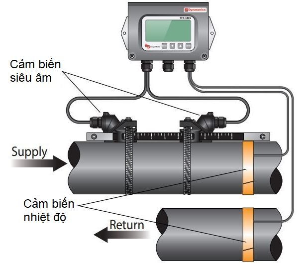 -Bộ phận phát sóng siêu âm : Đặt đặt bên trong đồng hồ đo. Chức năng của nó là tạo ra sóng siêu âm và phát đi qua ống nước. Lưu lượng nước tỉ lệ thuận với sóng được phát ra.