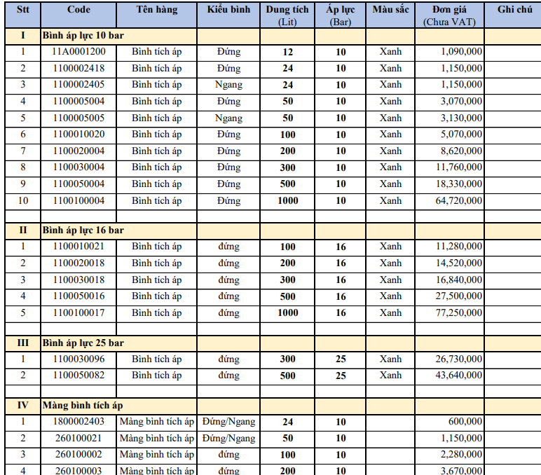 Bảng giá bình tích áp tại eriko.