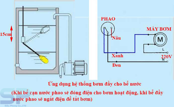 -Phao với các đặc tính tự động mở bơm khi nước trong hồ, bồn chứa cạn, tự động tắt bơm khi nước trong bể đầy.