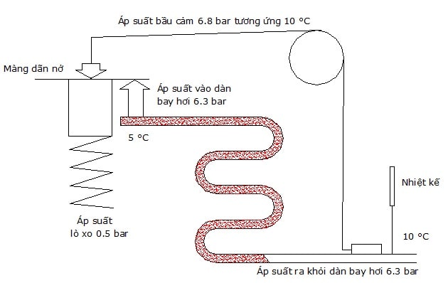 -Đo nhiệt độ: Đầu cảm biến nhiệt đo nhiệt độ của chất làm lạnh tại đầu ra của dàn bay hơi. Khi nhiệt độ tăng, chất lỏng trong đầu cảm biến sẽ giãn nở và tạo ra áp suất trong ống mao dẫn.
