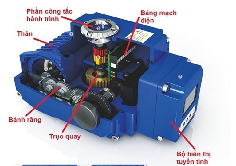 -Phần bộ truyền động điện Phần bộ truyền động điện là nơi lắp đặt động cơ điện để điều khiển chuyển động của cánh van. Khi động cơ hoạt động, nó sẽ truyền lực thông qua một cơ cấu cơ khí (bánh răng, trục vít) giúp đóng hoặc mở van. Bộ truyền động điện có thể được kết nối với hệ thống điều khiển từ xa hoặc tích hợp với cảm biến để tự động vận hành theo các chỉ số đo lường trong hệ thống.