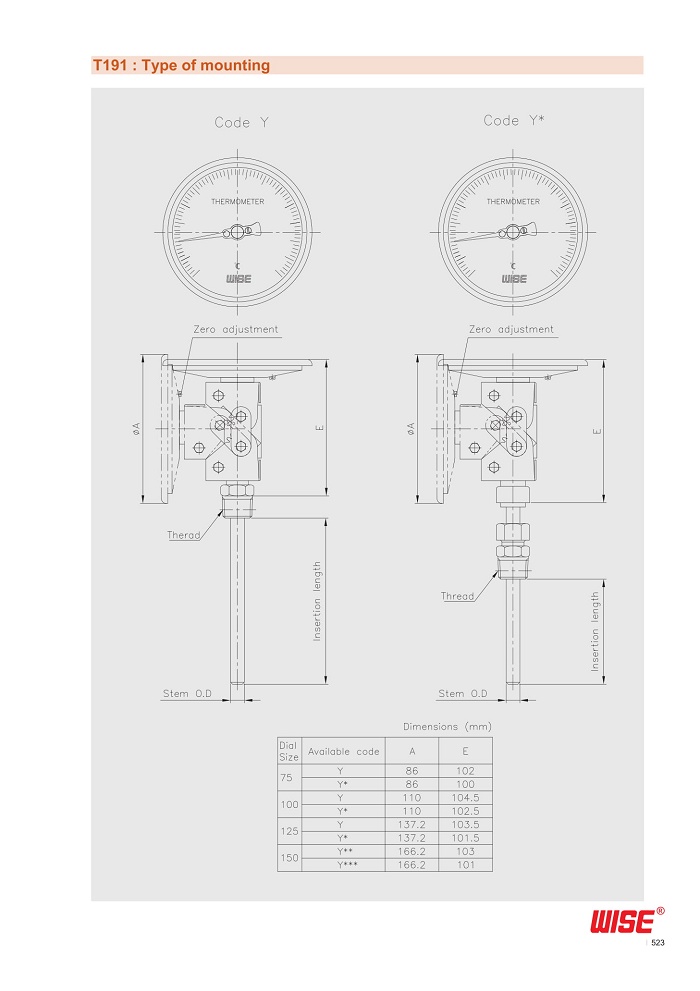 2. Cấu tạo, Catalogue đồng hồ nhiệt độ T191