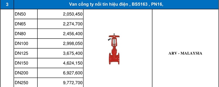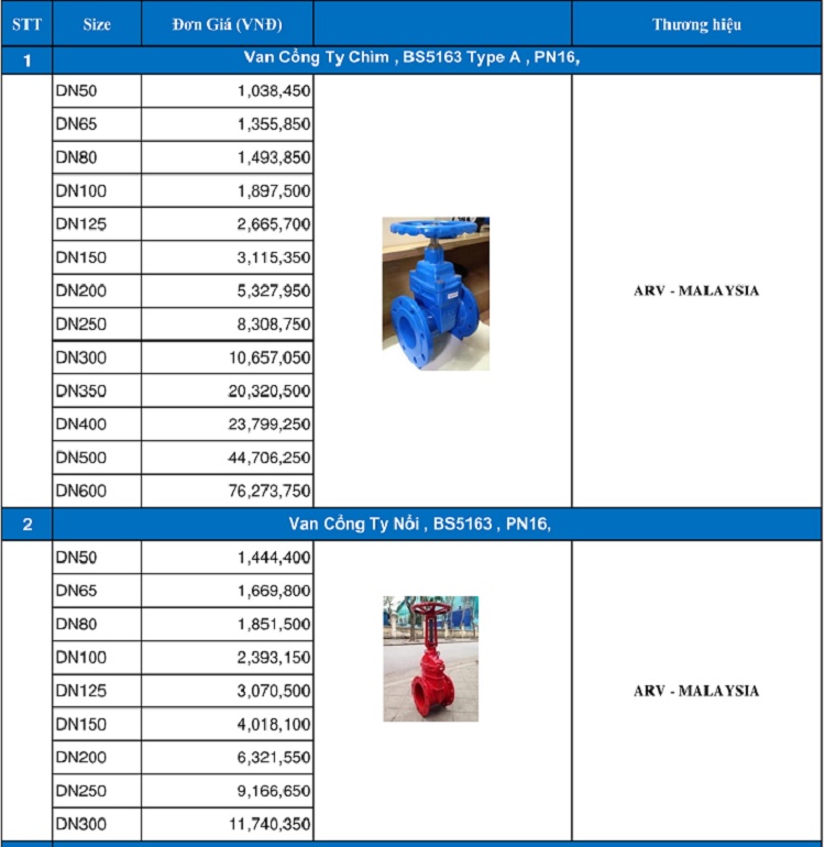 Bảng giá van cổng ARV.