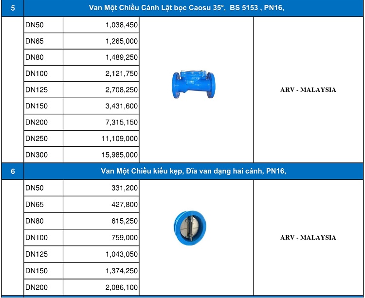 Bảng giá van một chiều ARV.
