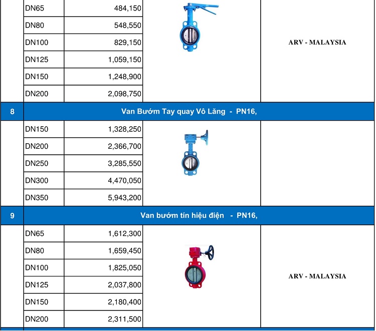 Bảng giá van bướm ARV.