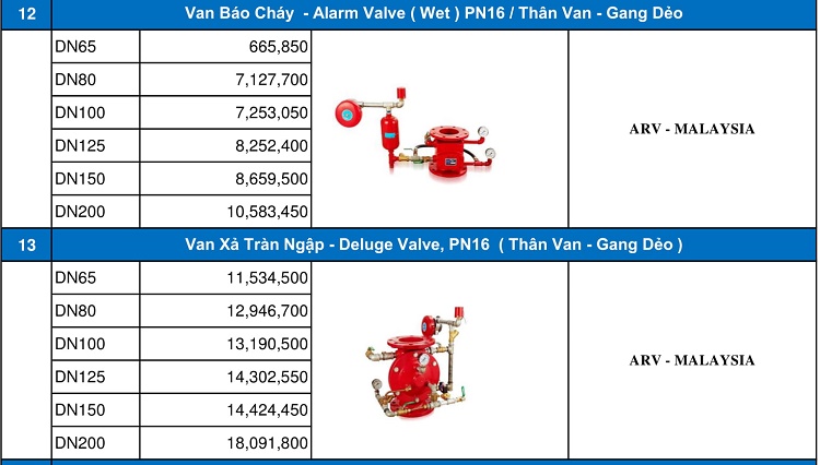 Bảng giá van xả tràn, van tràn ngập ARV, van báo cháy ARV.