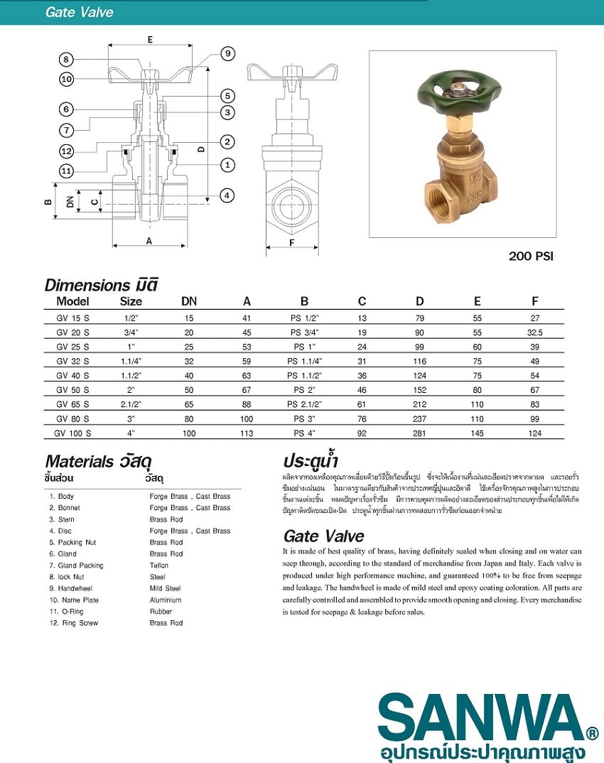 Van cửa đồng Sanwa GV 100 S-4'' hay van cửa đồng Sanwa DN100 được nhập khẩu từ Thái Lan, van được làm từ chất liệu đồng được sử dụng trong các đường ống nước sạch dùng để đóng mở dòng chảy một cách nhanh chóng và hiệu quả.
