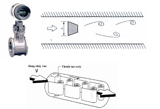 Vortex Flowmeter được hoạt động dựa trên nguyên tắt Karman Vortex Street. Bất kỳ chất lỏng nào khi chảy trong đường ống đều tạo ra nhiều dòng xoáy xung quanh nó,hiện tượng này gọi là hiện tượng Vortex shashing. Một Vortex Flowmeter bao gồm một cảm biến và một bộ chuyển dổi tín hiệu.Một thanh lá đứng được đặt tại giữa và vuông góc với đường ống. Số dòng xoáy tạo ra trong 1 giây được gọi là tần số của dòng xoáy. Tần số này tỉ lệ thuận với lưu lượng chất lỏng chảy trong đường ống.
