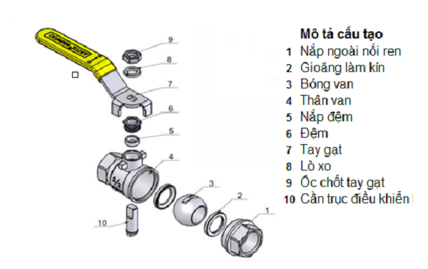 -Bi van: Là bộ phận lắp đặt trong thân van bi dạng hình cầu đục lỗ xuyên tâm. Quả bị được chế tạo từ inox, nhựa, thép chúng được cố định bởi gioăng làm kín và trục. Bi van dùng để chặn hay mở để dòng lưu chất đi qua.