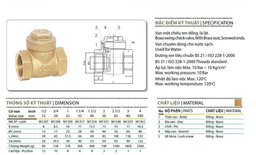 Thông số kỹ thuật van 1 chiều DN32.